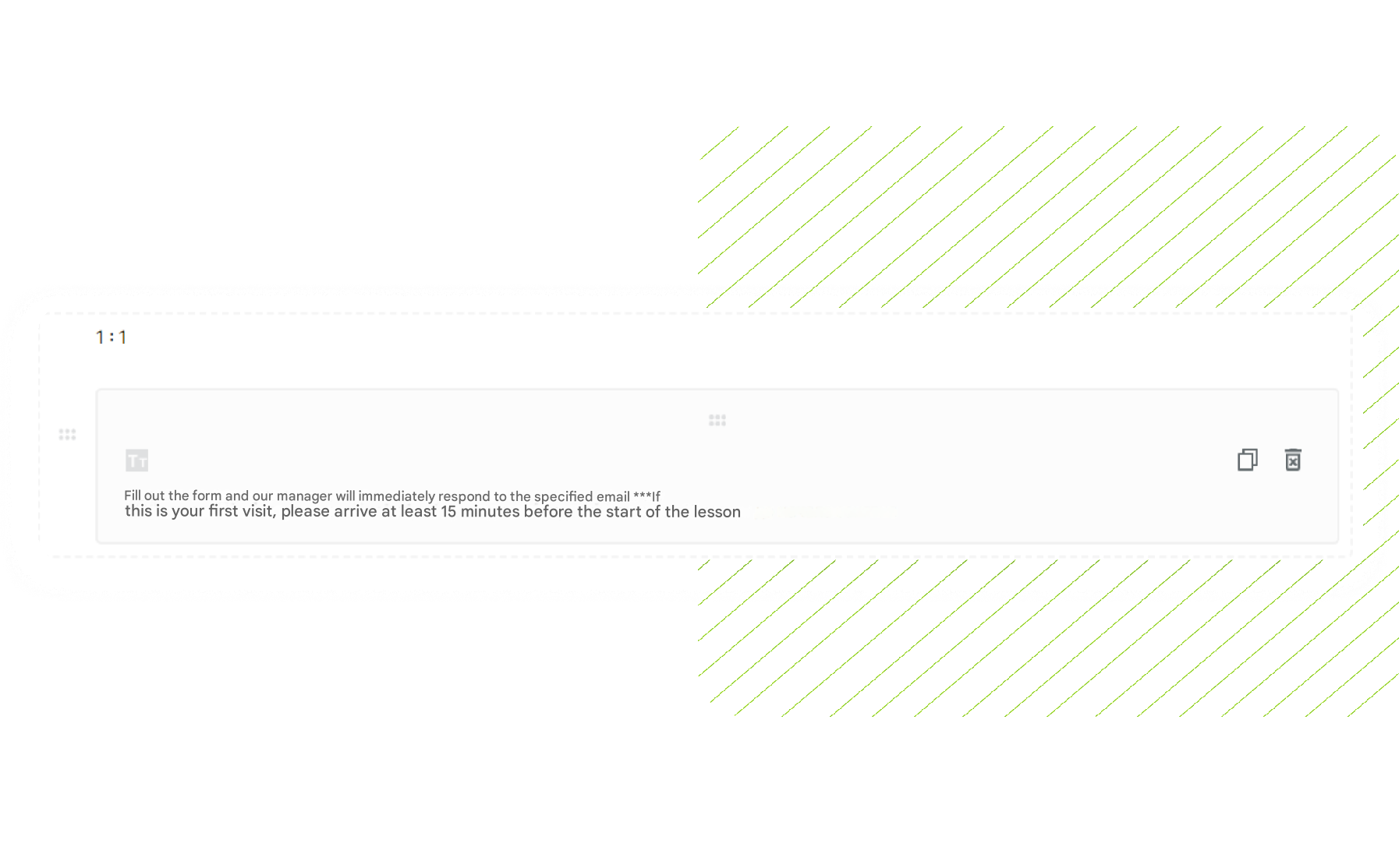 Add and configure field types: Place a text block. The field supports HTML tags, using which you can add elements and set styles inside tags. In our case, this is a title and useful information for the client