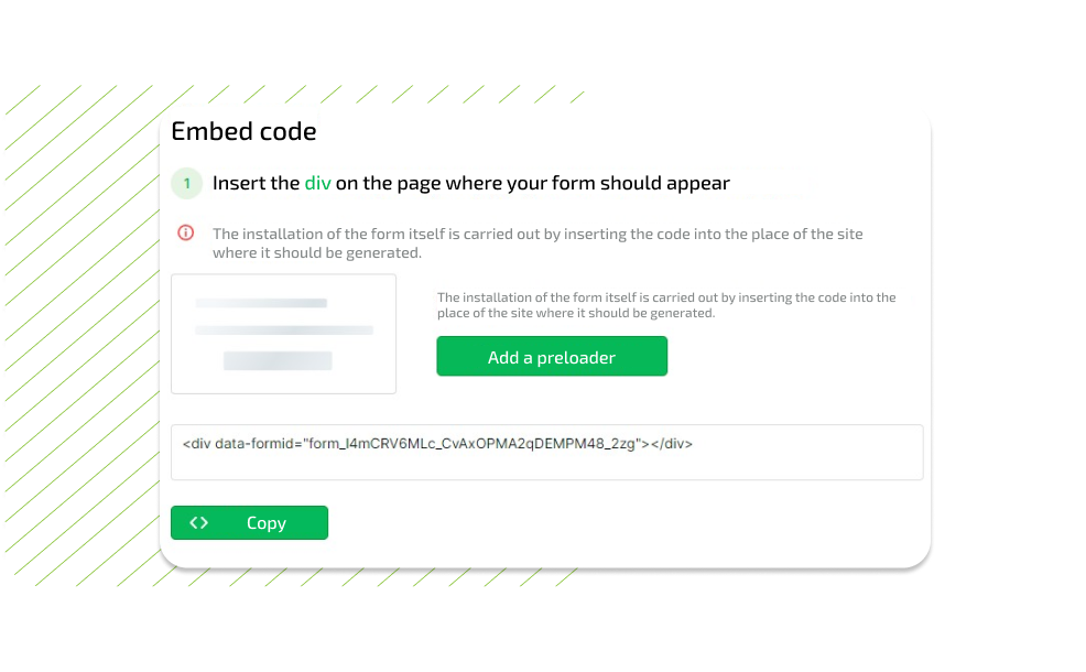 Go to the "Insert Code" tab. Copy the text from the DIV window to install the form and the script to call the form, paste it into the desired place on the site