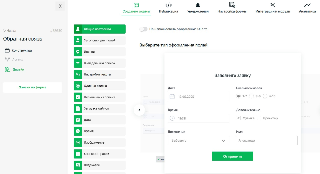 - Responsiveness and design. All forms created in QForm automatically adapt to different screen sizes (PC, tablets, smartphones). You can also customize the appearance of the form to match your website’s style — change the color scheme, fonts, buttons, or add a logo. An attractive and recognizable design improves user experience and increases trust.