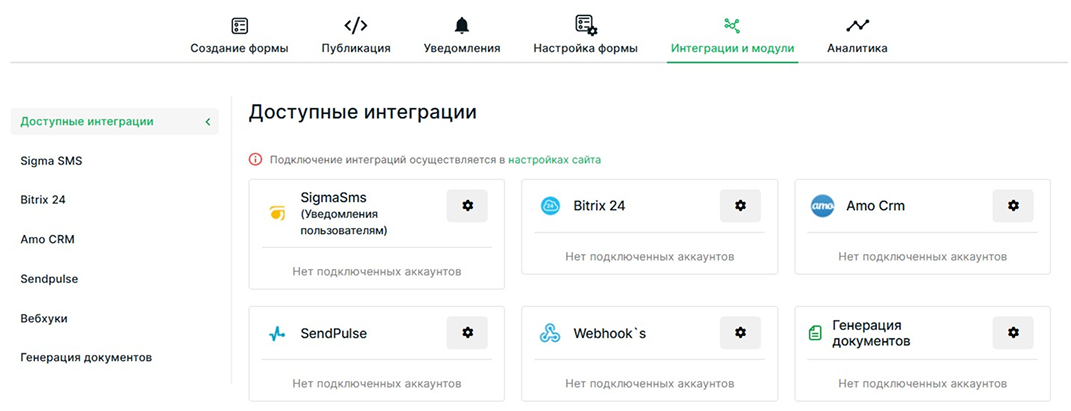 - Integrations with external services. QForm supports integration with popular tools for further data processing. You can connect it with email marketing services, CRM systems (e.g., Bitrix24, AmoCRM), messengers (Telegram, VK), and other platforms. Webhooks and APIs are also available for sending data to your own systems. This means that form submissions can be seamlessly integrated into your company’s existing business processes.