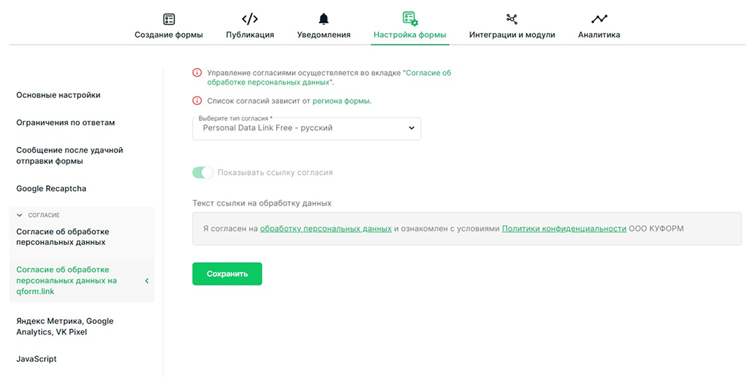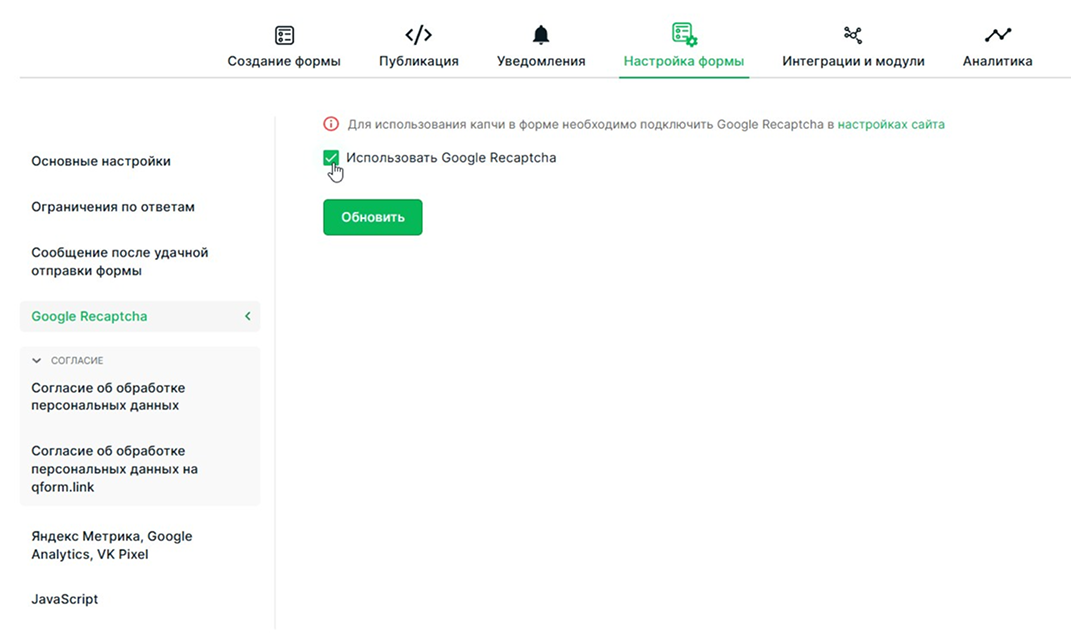 - Security and compliance. QForm pays special attention to data security. The service makes it easy to comply with data protection regulations: you can add a consent checkbox for processing personal data and configure the display of your privacy policy. Additionally, QForm includes anti-spam measures such as Google reCAPTCHA integration and its own filtering mechanisms for unwanted submissions. This ensures a clean request database and legal compliance when collecting information.