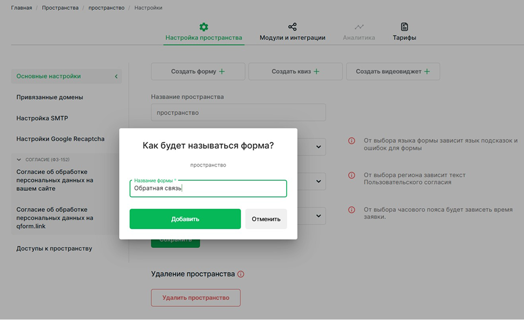 - Creating a new space. In QForm, all forms are tied to a specific space — essentially your website or project. On the main dashboard page, click “Add Space”.