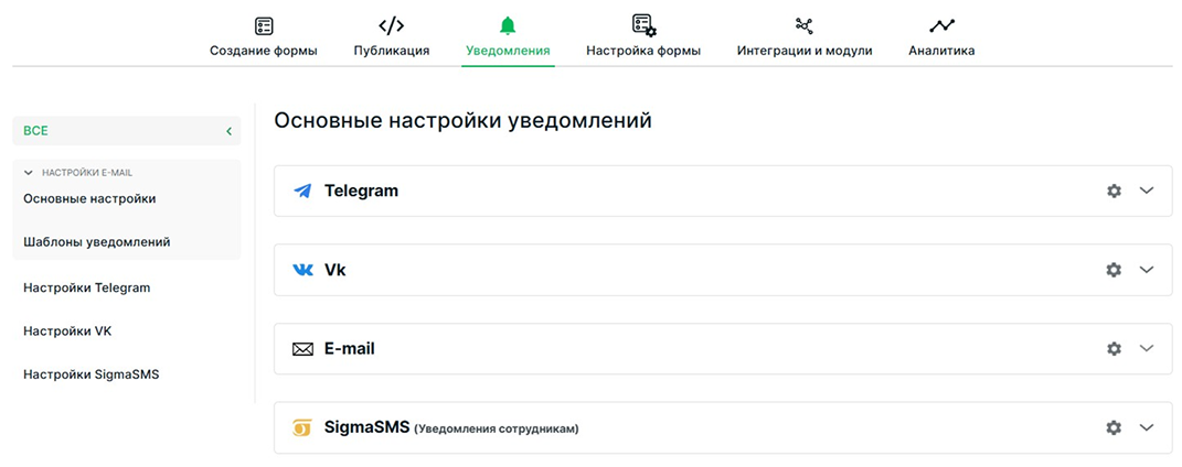 - Flexible notification system. To ensure no submission is missed, QForm provides convenient notification settings. You can receive alerts about new submissions via email, Telegram, or SMS by configuring the corresponding modules in your dashboard (ready-made integrations are provided). In addition, you can send automatic responses to users — for example, a confirmation email acknowledging receipt of their submission.