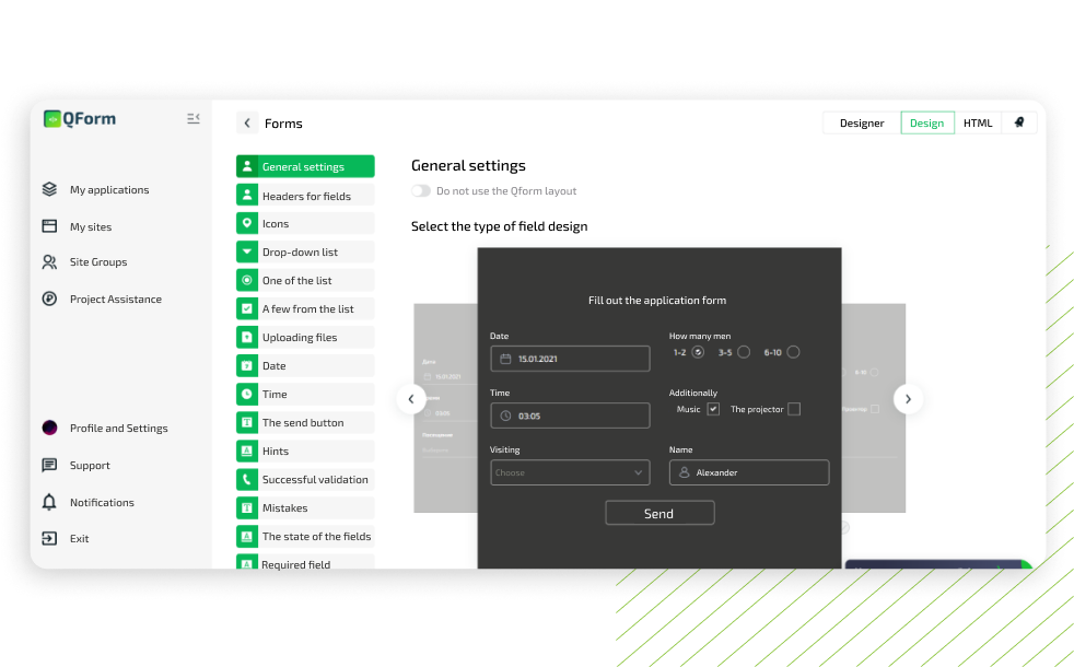 Customize the design of the form elements, its width, field validation, anti-captcha, etc.